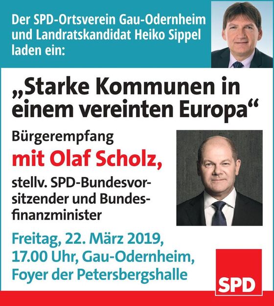 Petersberggemeinde. Der SPD-Ortsverein Gau-Odernheim und Heiko Sippel laden aus diesem Anlass am Freitag, dem 22. März, um 17.00 Uhr zu einem öffentlichen Bürgerempfang in das Foyer der Petersberghalle ein. Scholz wird zum Thema "Starke Kommunen in einem vereinten Europa" sprechen. Zuvor wird Heiko Sippel auf die Zukunftsthemen des Landkreises eingehen. Für das leibliche Wohl sorgt der SPD-Ortsverein. Die Bevölkerung ist herzlich eingeladen.