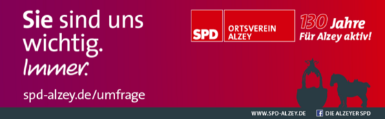 Unter dem Motto „Sie sind uns wichtig. Immer.“ führt die Alzeyer SPD eine große Postkarten- und Online-Umfrage durch. Dabei geht es um die Meinung der Bürgerinnen und Bürger zum Leben in Alzey. „Was läuft gut? Was sollte verbessert werden? Welche Anregungen und Ideen gibt es?“ Die Antworten werden ausgewertet und die Ergebnisse sollen in die politische Arbeit der nächsten Jahre einfließen. „Nach der erfolgreichen Durchführung der Mitmachtage zu den wichtigen Alzeyer Themen und zahlreicher Bürgergespräche in verschiedenen Bereichen der Stadt wollen wir damit eine weitere Möglichkeit für eine aktive Bürgerbeteiligung schaffen“, erklärt Ortsvereinsvorsitzender Heiko Sippel die Idee.